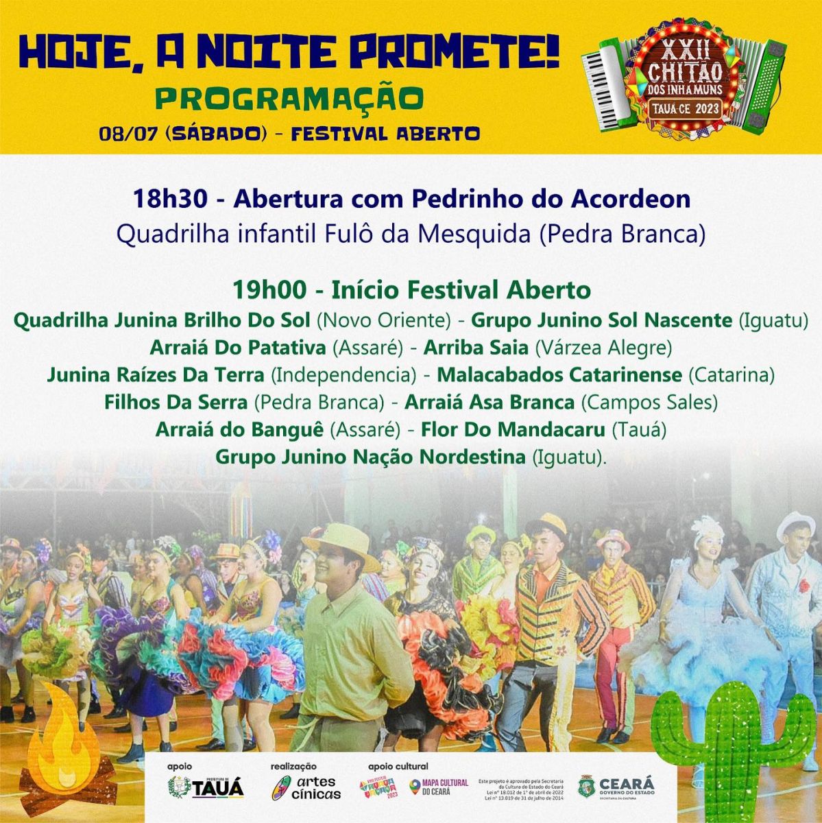 Na noite deste sábado (08), haverá a disputa na Fase Aberta do XXII Chitão dos Inhamuns, na Praça da Juventude, no Bairro Aldeota, com previsão de encerramento ao amanhecer deste domingo (09).