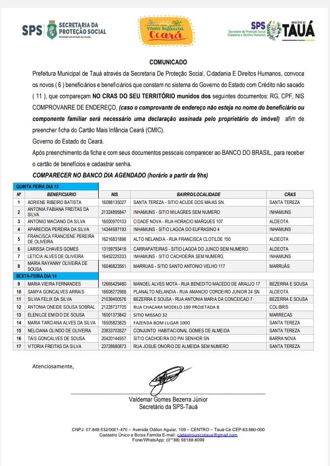 O Programa Cartão Mais Infância Ceará convoca 17 famílias que ainda não receberam o benefício no município de Tauá. Os relacionados deverão comparecer ao CRAS de seu território munidos munidos dos documentos: RG, CPF, NIS, comprovante de endereço (caso o comprovante de endereço não esteja no nome do beneficiário ou componente familiar será necessário uma declaração assinada pelo proprietário do imóvel) afim de preencher ficha do Cartão Mais Infância Ceará (CMIC).