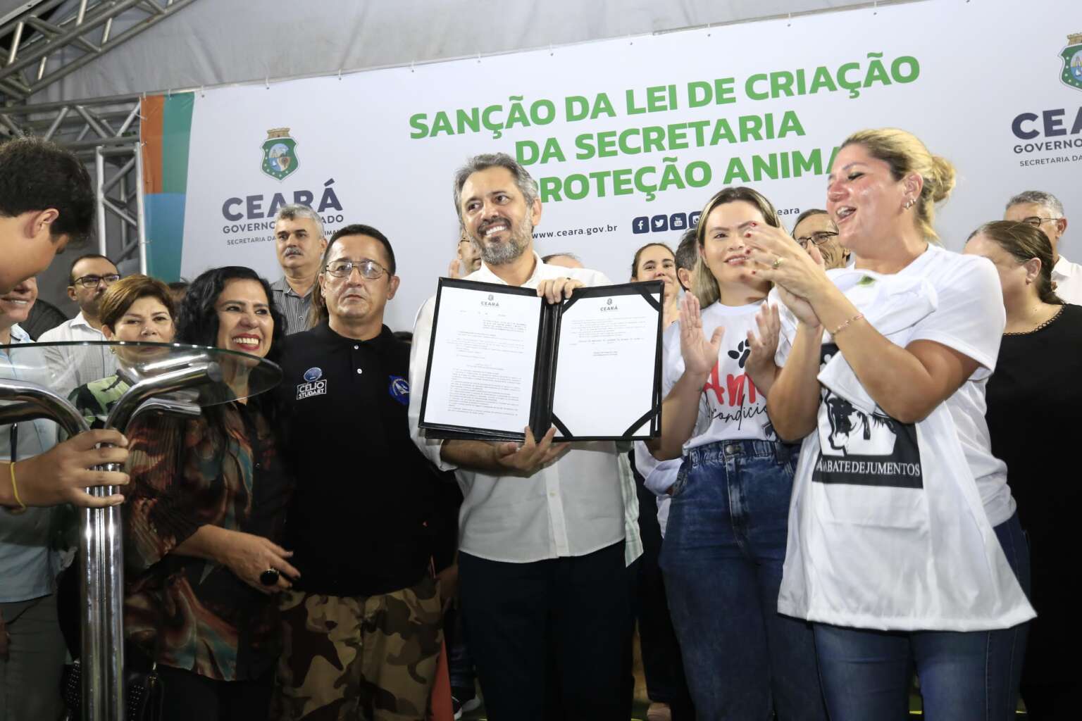 O governador Elmano de Freitas sancionou, nesta quinta-feira (27), lei que cria a Secretaria da Proteção Animal. A nova Pasta fortalecerá a Política Estadual de Proteção Animal e ficará responsável pelo desenvolvimento e a implementação de políticas públicas efetivas e sustentáveis para os animais e o meio ambiente. Também participaram do momento a senadora Augusta Brito; o presidente da Assembleia Legislativa, Evandro Leitão; a primeira-dama do Estado, Lia de Freitas; o reitor da Universidade Estadual do Ceará (Uece), Hildebrando dos Santos Soares; entre outras autoridades.