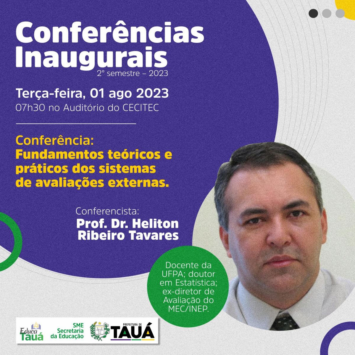 Os eventos acontecerão nesta terça-feira (01) e quarta (02/08). No primeiro dia, será presencial a partir das 7:30h da manhã no auditório do CECITEC, com o conferencista profº Dr. Heliton Ribeiro Tavares. Já a partir de 13h, acontecerá a Webconferência ministrada pelo profº Mestre Cezar Braga Said.