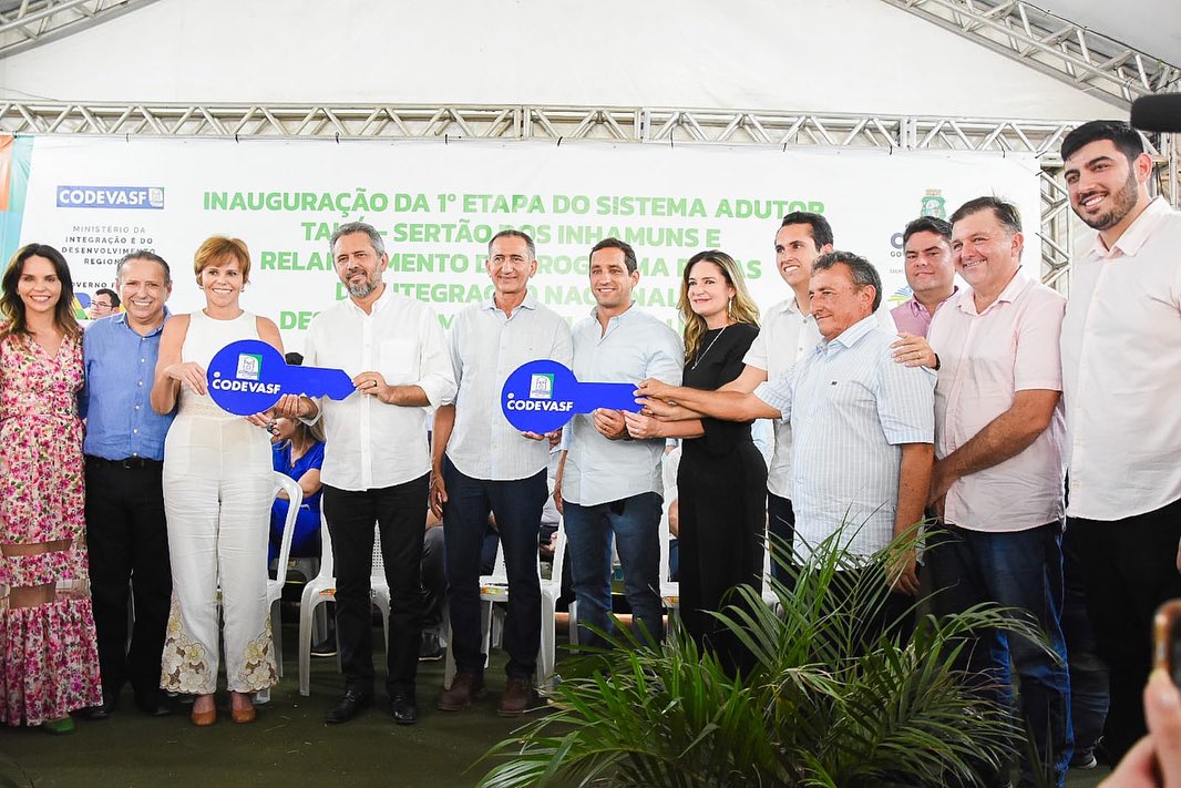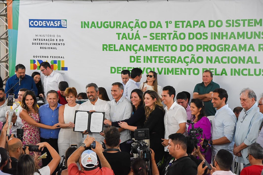 Por fim, o ministro participou da inauguração da primeira etapa do Sistema Adutor Tauá-Sertão dos Inhamuns, com acionamento do esguicho de água para marcar o início do funcionamento do sistema. Ao todo, o sistema conta com 42km de extensão, iniciando no Açude Arneiroz II e finalizando na unidade da Companhia de Água e Esgoto do Ceará (Cagece), na sede do município. A infraestrutura vai ajudar no abastecimento dos municípios de Tauá, Parambu e Catarina, beneficiando mais de 60 mil pessoas. O investimento na obra foi de R$ 64,6 milhões, somados recursos federais e do governo cearense.