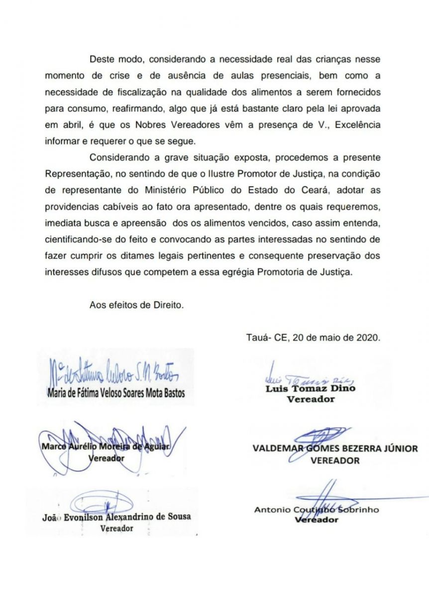 Uma comissão de vereadores da Câmara Municipal de Tauá entrou com Representação no Ministério Público da Comarca na tarde desta quarta-feira(20), denunciando a existência de merenda escolar vencida em várias escolas da rede municipal.