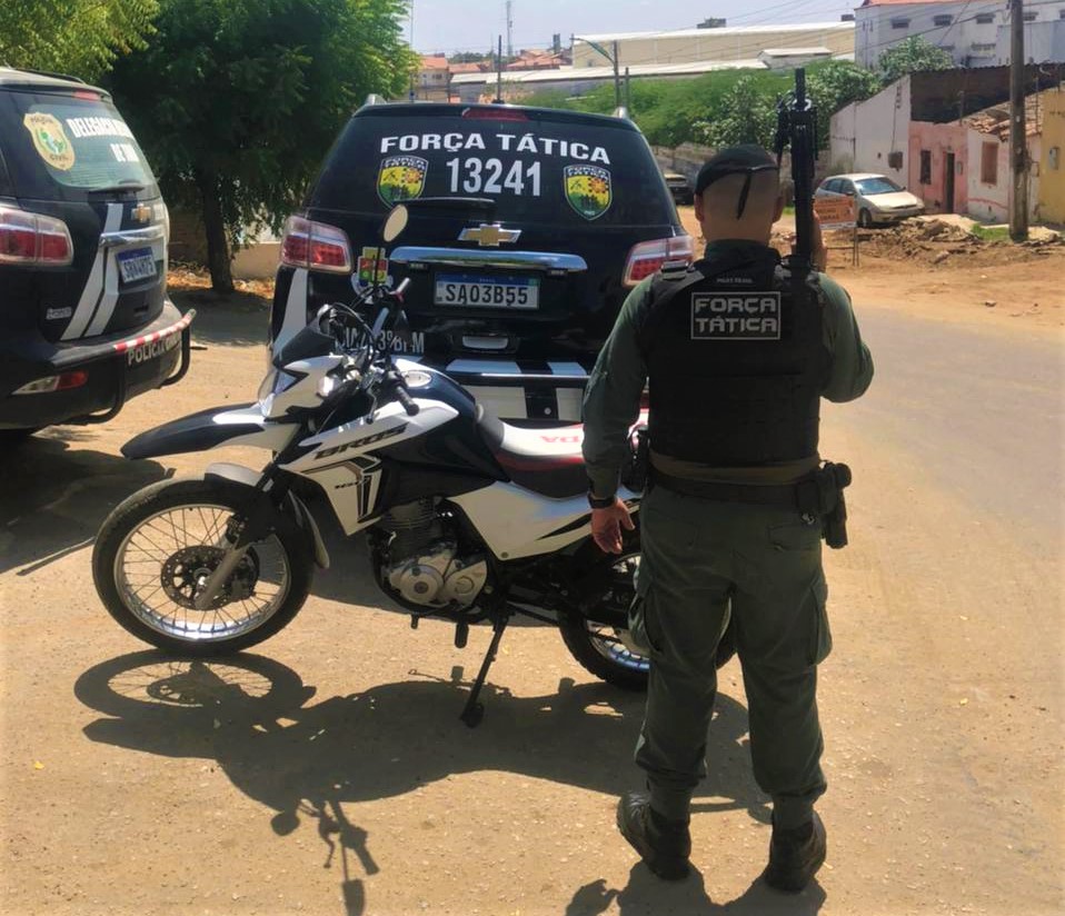 A motocicleta e as duas pessoas foram conduzidas para a Delegacia Regional de Polícia Civil para os procedimentos cabíveis.