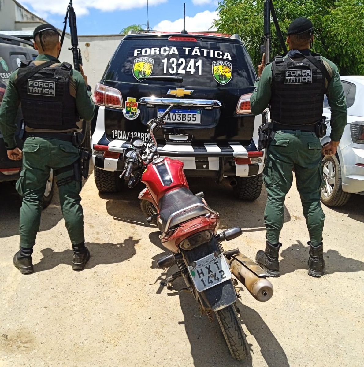 Uma moto Honda CG 150 Titan ES, cor vermelha, ano 2006, placa HXT 1442 com inscrição de Juazeiro do Norte/CE, foi apreendida pela equipe CHARLIE da Força Tática do 13º BPM e Destacamento local da PM, na manhã de hoje (23), durante patrulhamento na cidade de Arneiroz.