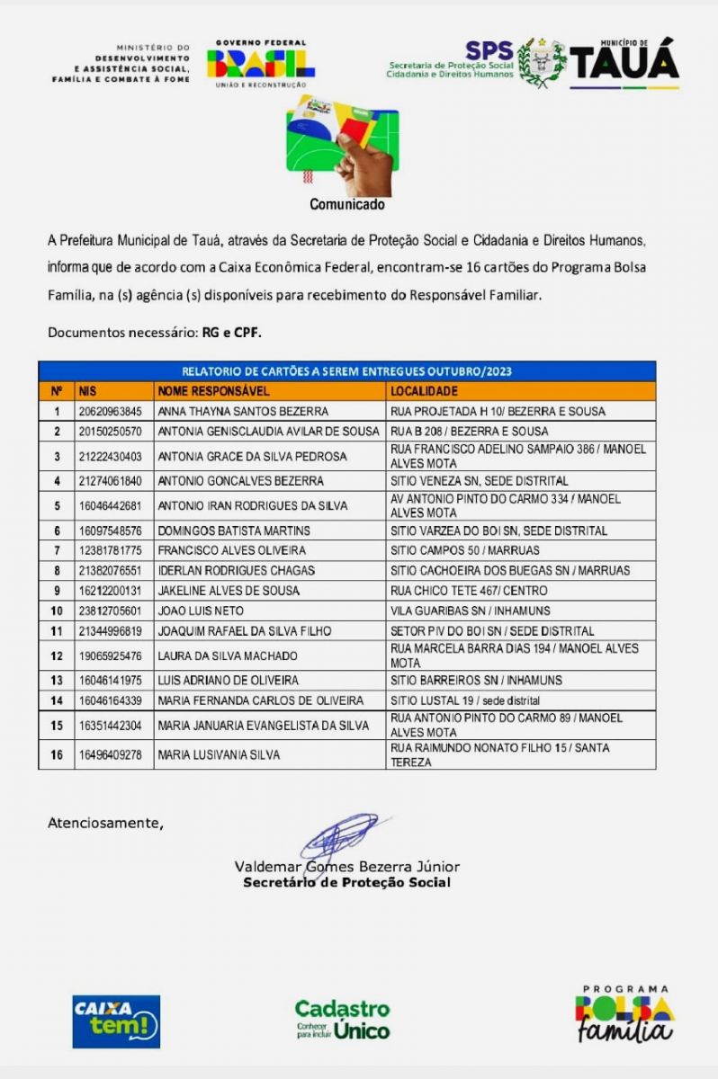 A Secretaria de Proteção Social, Cidadania e Direitos Humanos de Tauá convoca 16 beneficiários para receberem o cartão do Programa Bolsa Família, liberados nesse mês de outubro. A lista foi encaminhada hoje (25), ao Blog do Wilrismar.