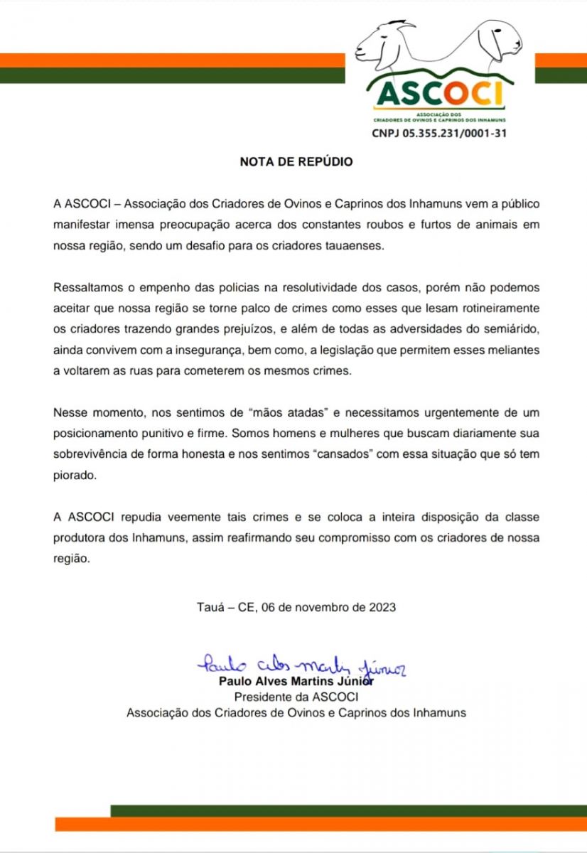 O Presidente da ASCOCI (Associação dos Criadores de Onivos e Caprinos dos Inhamuns), Paulo Alves Martins Júnior divulgou na manhã de hoje (06), nota de repúdio contra o constante furto de criações nas propriedades rurais de Tauá e municípios da Região dos Inhamuns.