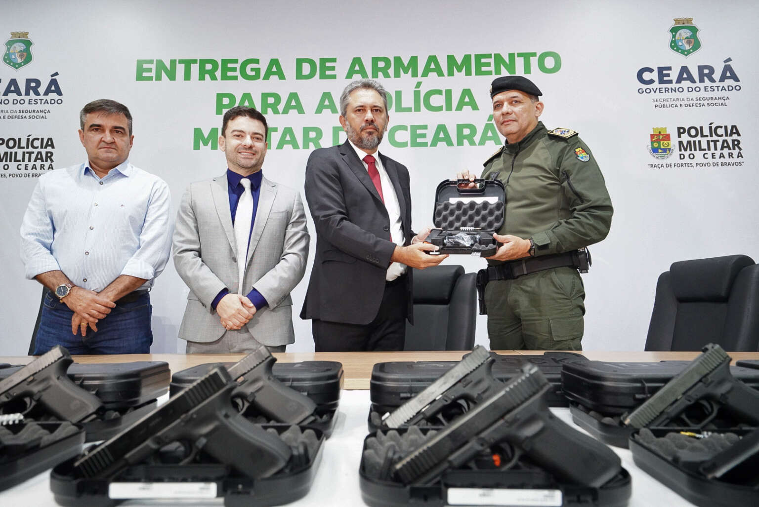 O governador Elmano de Freitas participou, nesta quinta-feira (7), da entrega de 2.280 pistolas Glock, das quais 2.150 são calibre .40 e 130 unidades do modelo 9mm, para a Polícia Militar do Ceará (PMCE). O evento aconteceu no Centro Integrado de Segurança Pública (Cisp), em Fortaleza. Também estiveram presentes o secretário da Segurança Pública e Defesa Social, Samuel Elânio; o comandante-geral da PMCE, coronel Klênio Savyo; entre outras autoridades.