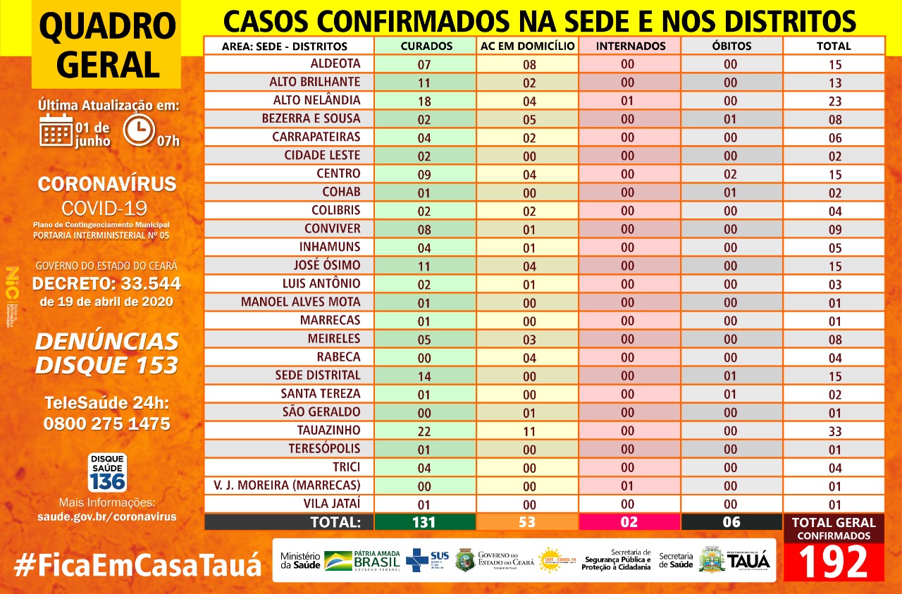 No boletim anterior divulgado na tarde do último sábado(30), Tauá tinha 190 casos confirmados com 123 curados e 61 pacientes infectados.