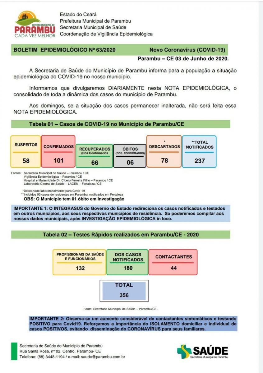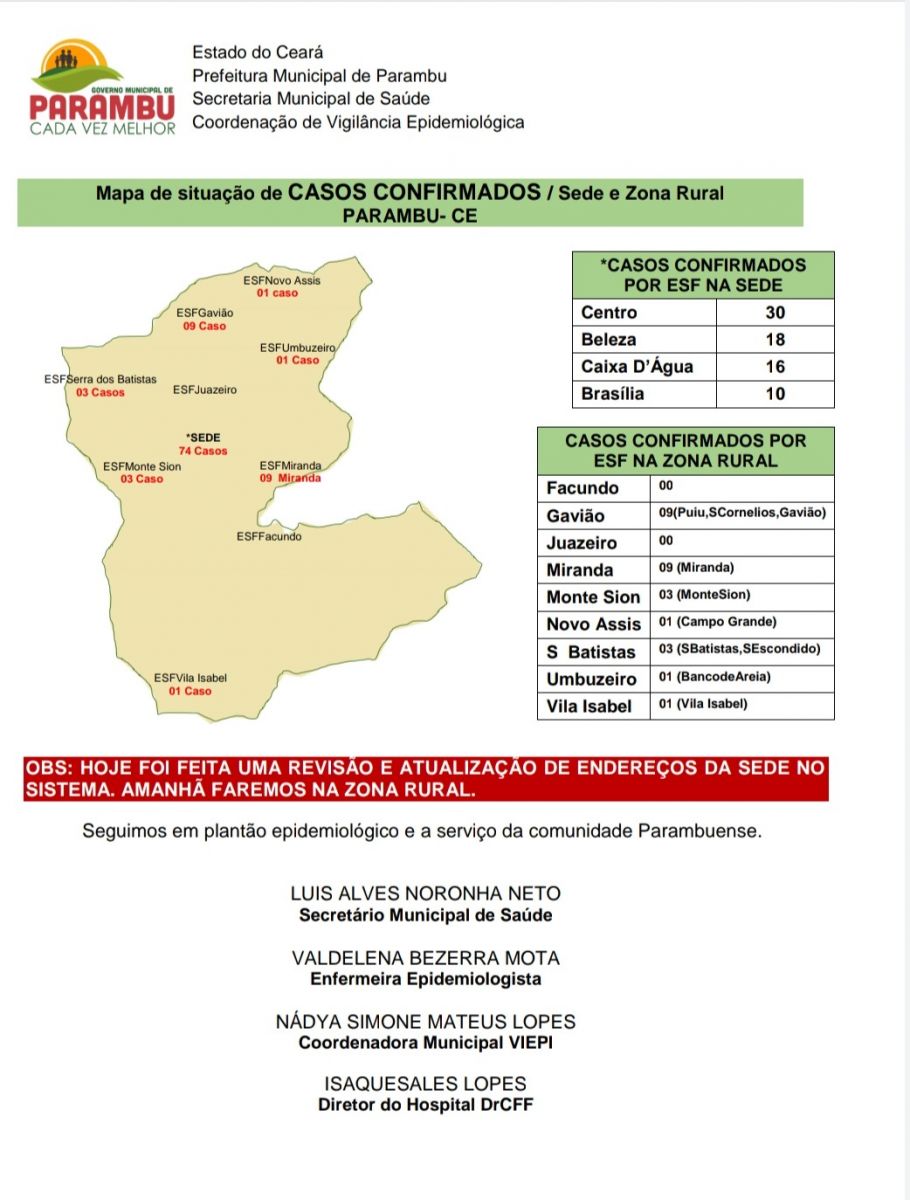 O município de Parambu atingiu hoje(03), o número de 101 casos confirmados desde o início da pandemia do coronavírus, segundo o boletim epidemiológico divulgado pela Secretaria de Saúde.