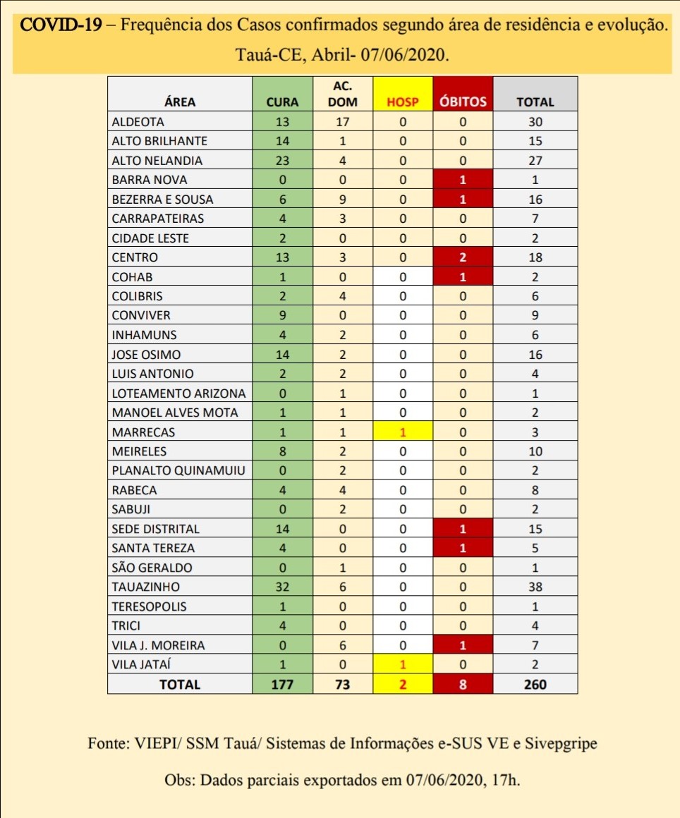 Desde o início da pandemia, o município já confirmou 260 casos, com 177 pacientes curados. No boletim anterior, divulgado na noite do último sábado(05), eram 258 casos, com 176 pacientes curados.
