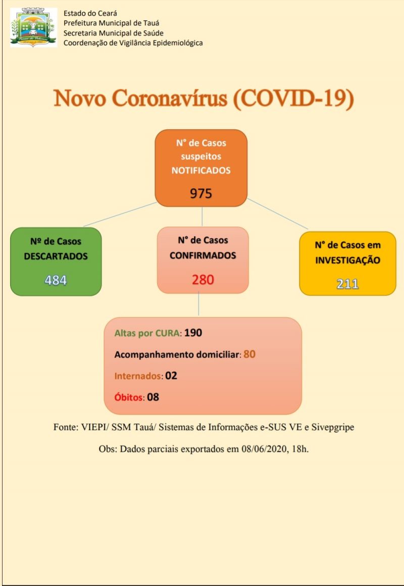 Na manhã de ontem(08), a Secretaria de Saúde atualizou os números da pandemia do coronavírus no município de Tauá. Houve pequena alteração em relação ao boletim epidemiológico anterior.