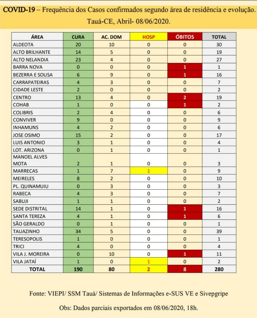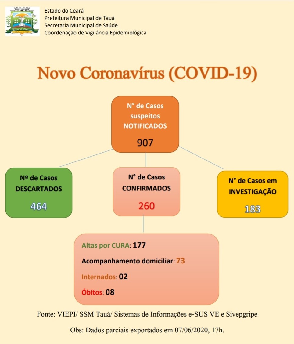 O boletim mostra ainda um aumento substancial do número de casos confirmados de Covid-19, na Vila Joaquim Moreira, distante aproximadamente 25km da cidade de Tauá, situada no distrito de Marrecas.