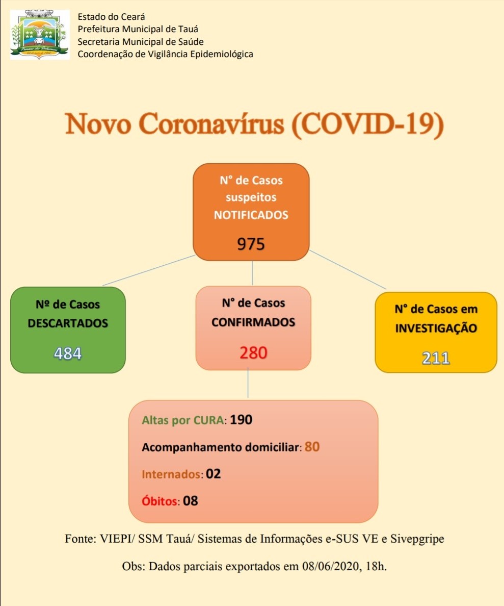 Desde o início da pandemia, o município já confirmou 280 casos, com 190 pacientes curados. No boletim anterior, divulgado na manhã de ontem(08), eram 260 casos, com 177 pacientes curados.