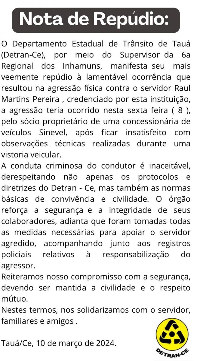 Na nota, o Supervisor Regional do Detran de Tauá identifica as partes envolvidas no caso da agressão.