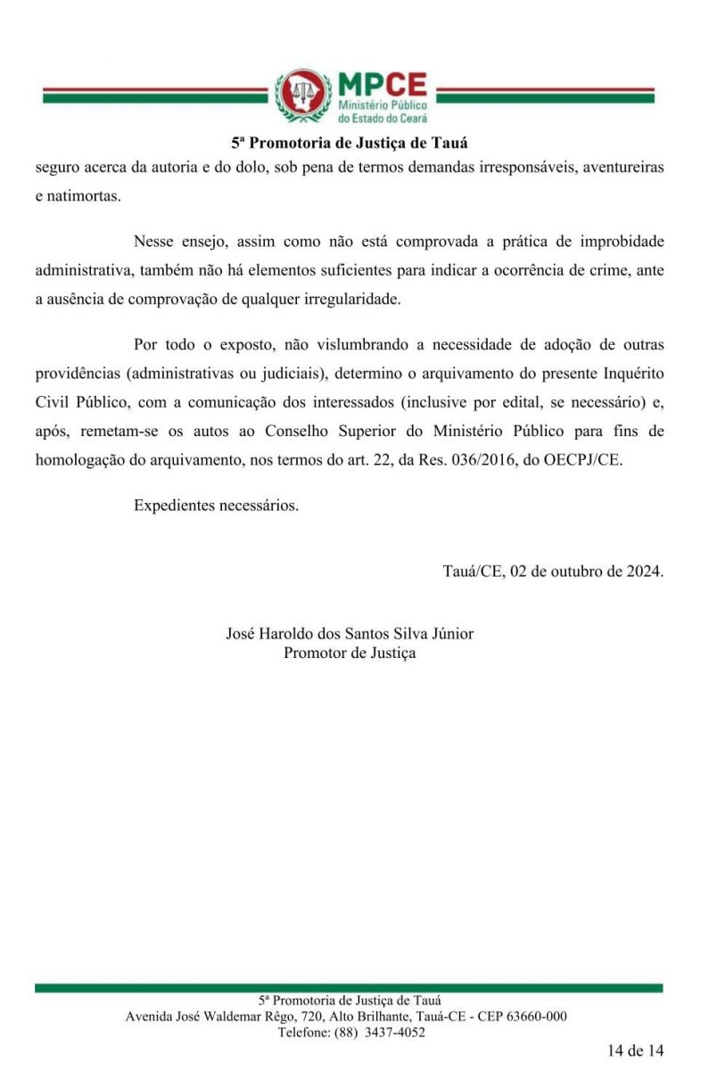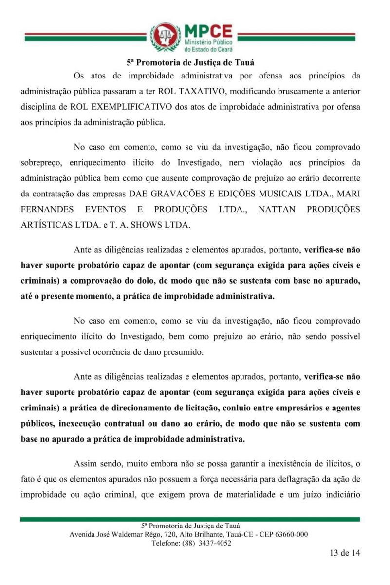 Após as investigações, o Promotor cita no documento de 14 páginas, que nenhuma das diversas denúncias apresentadas no processo foram comprovadas. "Os valores pagos pelo Município de Tauá às empresas responsáveis pela carreira dos artistas, são os mesmos contratados por diversos municípios do Estado do Ceará e eventuais contratos em valores maiores ou menores se dão por conta de outras circunstâncias que não podem ser atribuídas ao ordenador de despesas", diz trecho do Despacho.