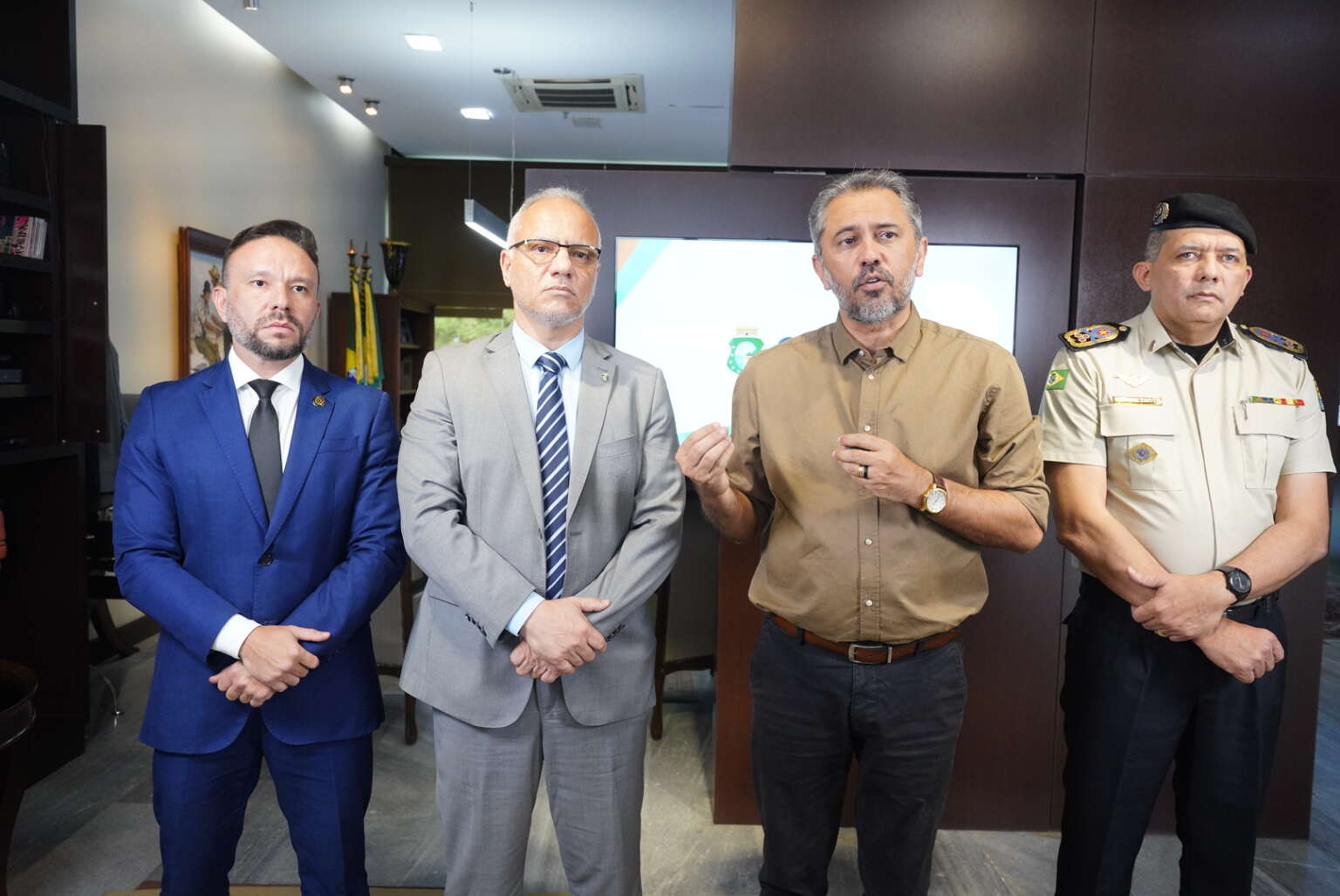 O governador Elmano de Freitas anunciou a convocação de 170 policiais militares aprovados no concurso da Polícia Militar do Estado do Ceará (PMCE). Anúncio foi feito ao lado do secretário da Segurança Pública e Defesa Social (SSPDS), Roberto Sá, o coronel comandante-geral da PMCE, Klênio Savyo e o diretor geral da Academia Estadual de Segurança Pública, Leonardo Barreto.