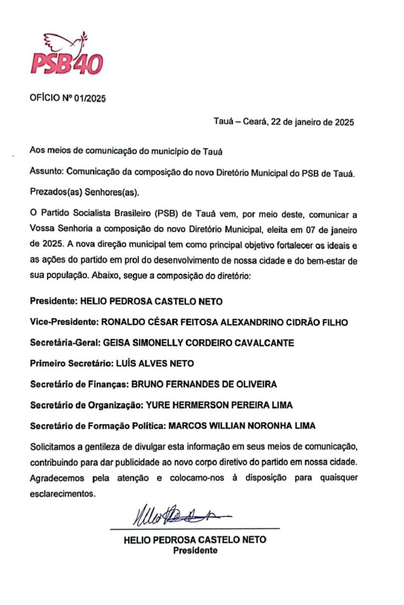 O PSB de Tauá anunciou na manhã de hoje (23/01), a composição de sua nova Executiva Municipal. O vereador Dr. Hélio Castelo, que foi o mais votado do partido nas Eleições 2024, com 1.926 votos, presidirá a sigla.