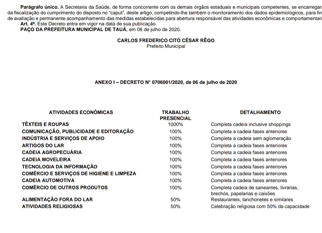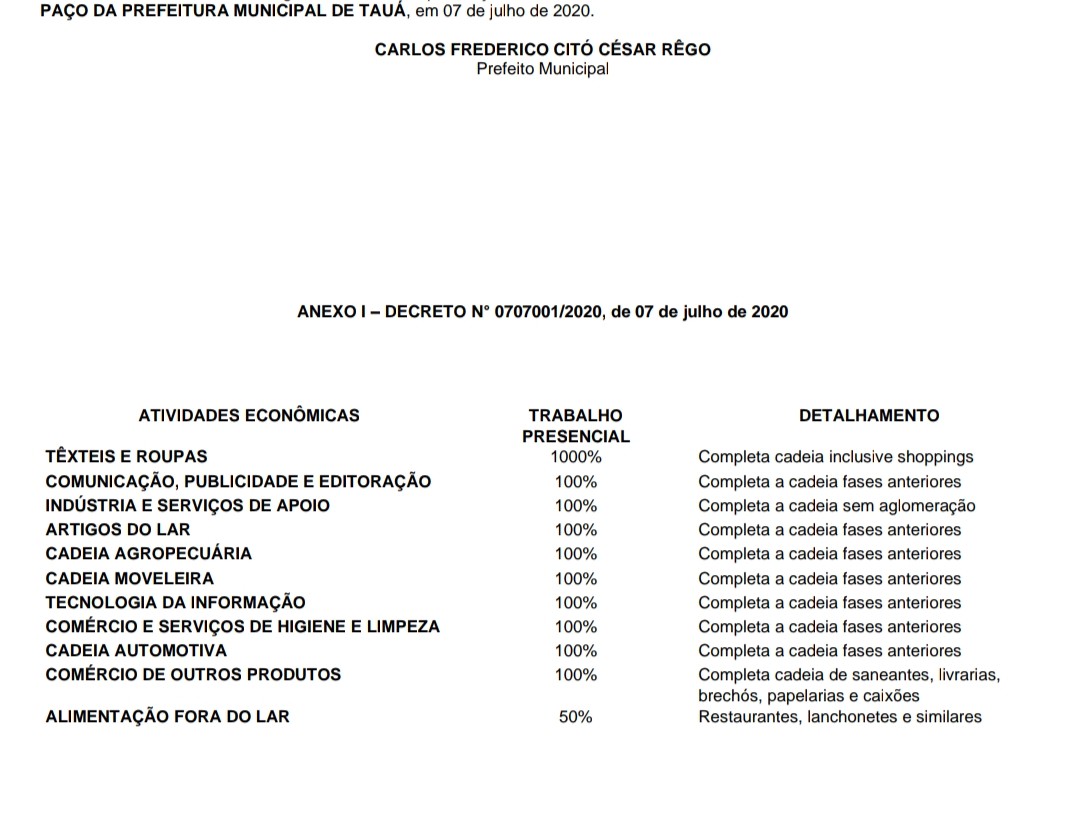 Um erro cometido pela Prefeitura de Tauá obrigou a revogação de trecho do Decreto que prorroga as medidas adotadas no decreto de 17 de março e alterações posteriores, e estabeleceu o inicio da Fase 01 de liberação das atividades econômicas do plano de retomada elaborado pelo Governo do Estado.