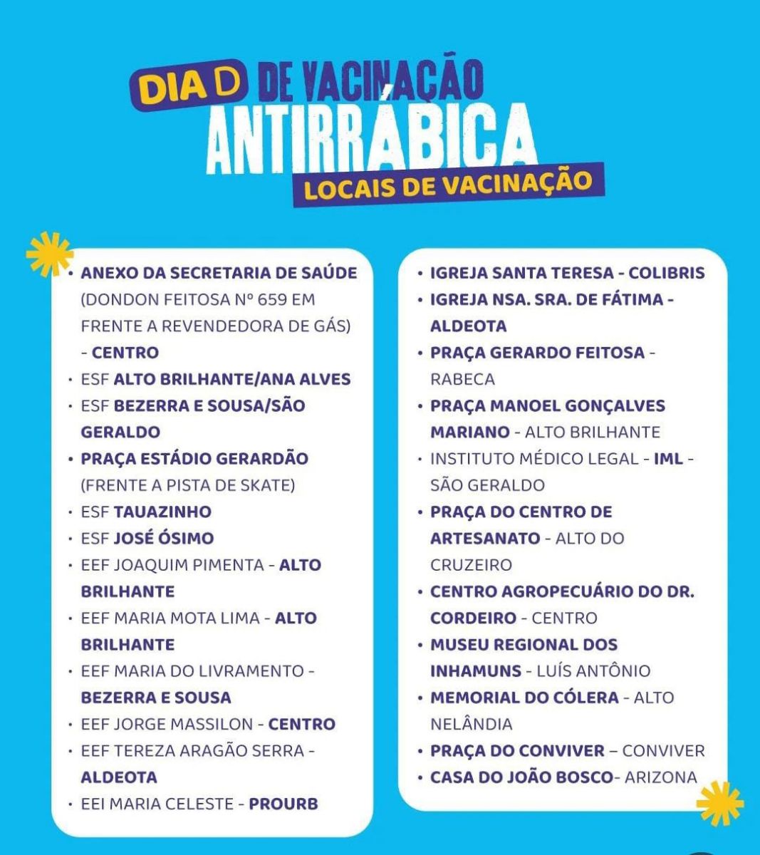 Após a realização do Dia D, a Secretaria de Saúde divulgará o cronograma da vacinação nas localidades do interior do município, que será feito de forma itinerante. O cronograma será divulgado nos próximos dias.