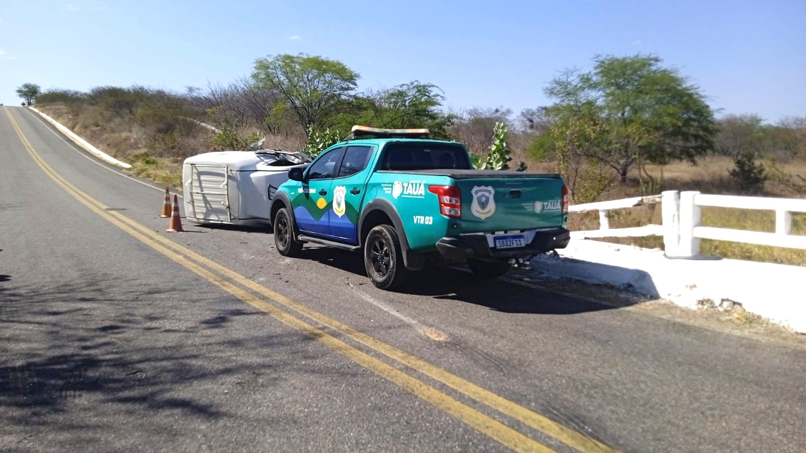 Um veículo Fiat Fiorino furgão, cor branca, ano 2019/2020, placas, POE-5H53, com inscrição de Juazeiro do Norte, capotou por volta de 13h50 de hoje (15/09), na CE-176, a altura da ponte das Melancias, próximo a cidade de Tauá.