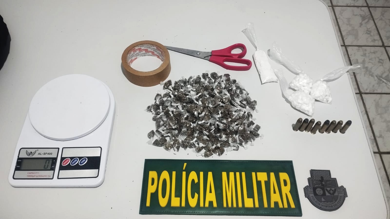 Como o Destacamento já havia recebido denúncias anônimas sobre movimento de pessoas entrando e saindo do imóvel, a composição resolveu averiguar e como não havia ninguém, os policiais resolveram entrar na casa, onde encontraram uma bolsa contendo munições cal .38, balança de precisão, tesoura, sacos plásticos para confecção das drogas, 120g de maconha e 67g de cocaína.