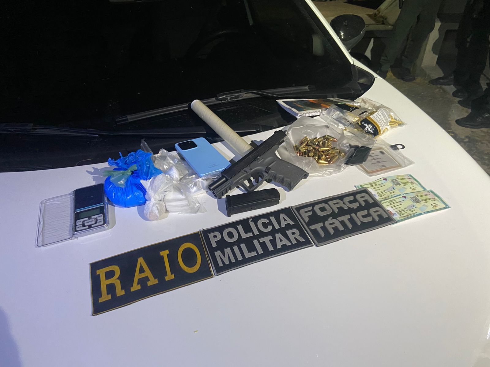 No imóvel, foram encontrados, 01 pistola Calibre .9mm, 43 munições calibre .9mm; 341,1 gramas de cocaína e 24,3 gramas de crack.