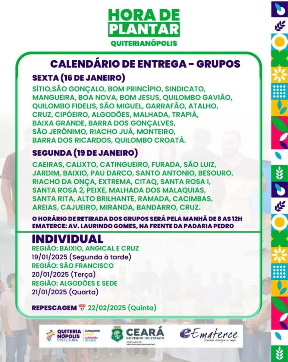 De acordo com o cronograma divulgado, o atendimento será feito no Escritório da Ematerce, situado na Av. Laurindo Gomes, no horário de 8h às 12h, iniciando com a entrega da semente aos grupos de produtores.
