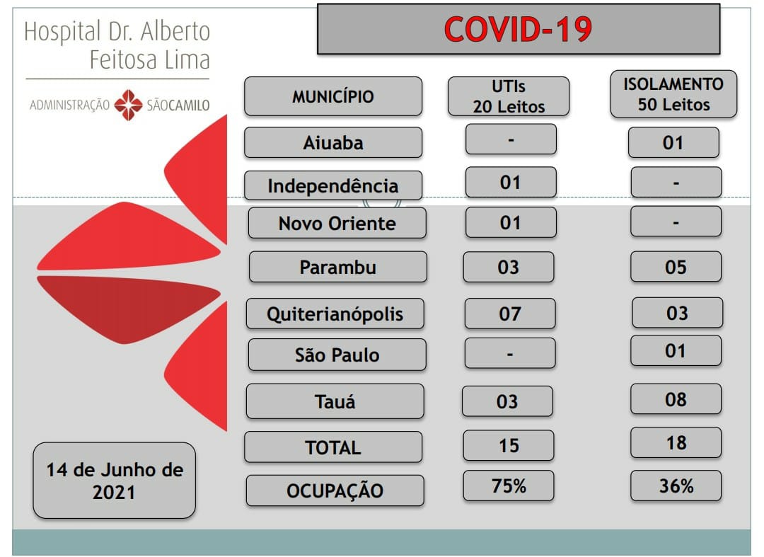 O Boletim divulgado hoje(14) pelo Hospital Dr. Alberto Feitosa Lima, apresenta queda na taxa de ocupação de leitos de UTI-Covid no Município de Tauá.
