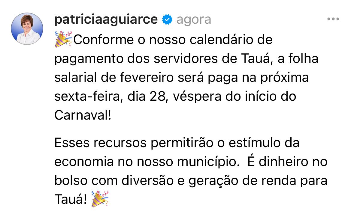 A Prefeita de Tauá, Patrícia Aguiar, anunciou na tarde de hoje (24/02), pelas redes sociais, que o pagamento do mês de fevereiro dos servidores municipais, será efetuado na sexta-feira (28/02), véspera do carnaval.