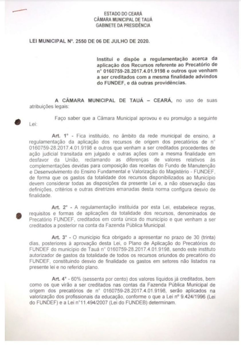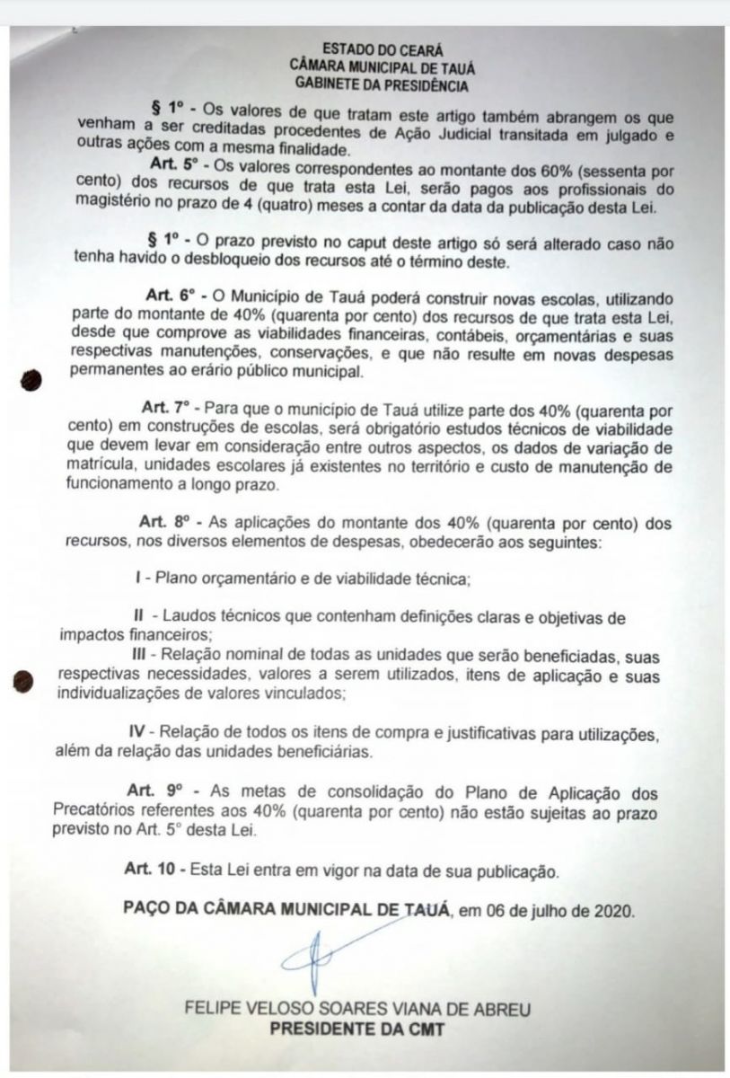 O Presidente da Câmara Municipal de Tauá, vereador Felipe Viana promulgou a Lei Municipal que vincula 60% do valor dos precatórios do Fundef para rateio entre os professores da rede municipal de ensino.