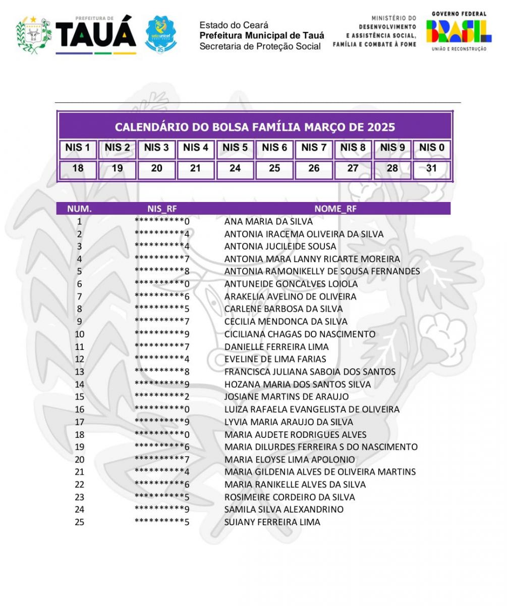 Mais 25 famílias, entre benefícios renovados e novos beneficiários, foram incluídas pelo Ministério do Desenvolvimento Social e Combate a Fome, no Programa Bolsa Família a partir de março no município de Tauá.