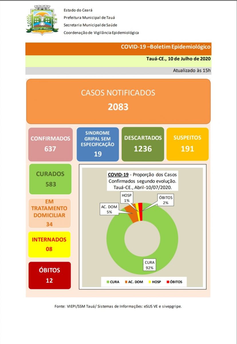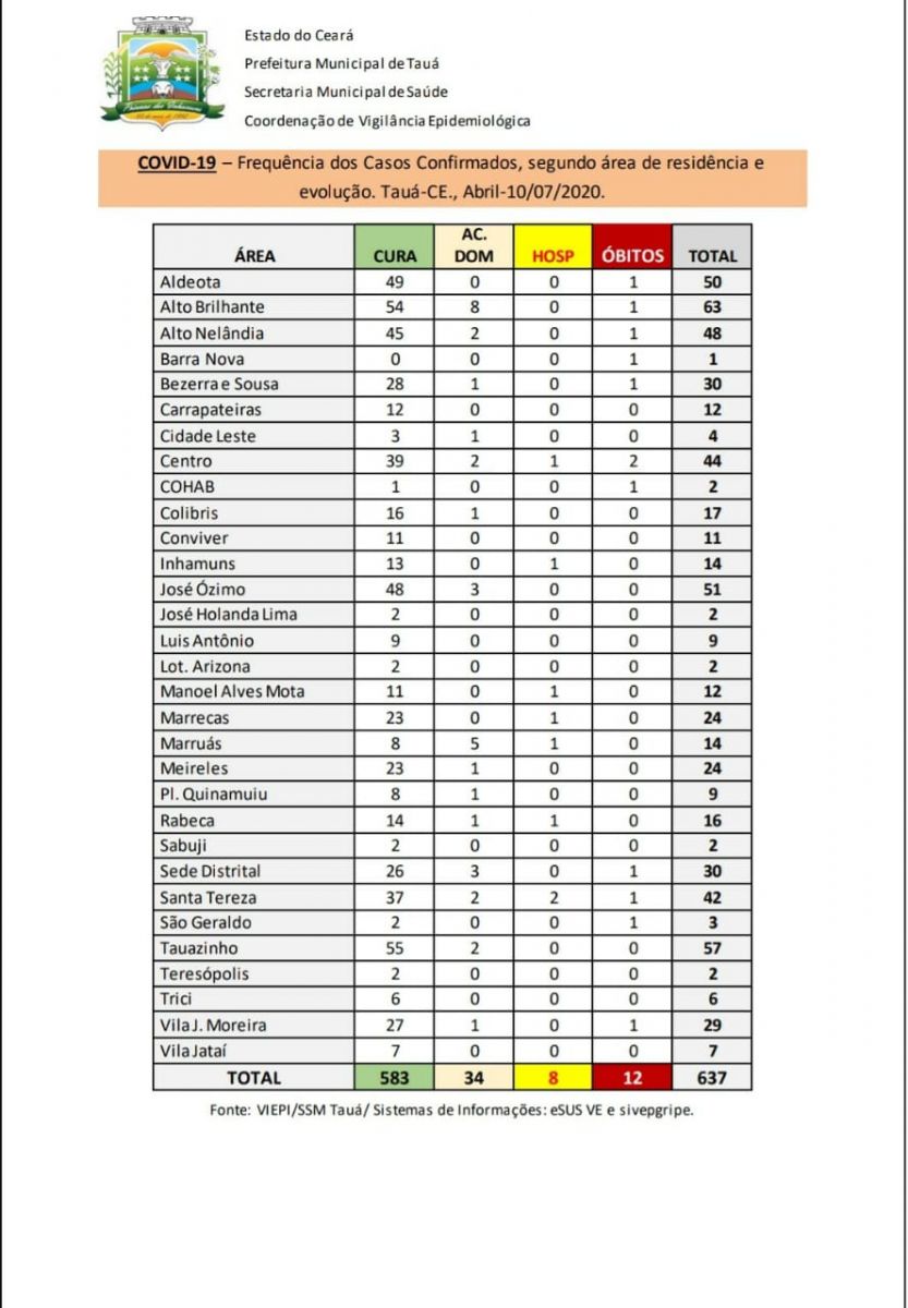 Os casos confirmados desde o início da pandemia são 637, com 583 pacientes curados e 12 óbitos.