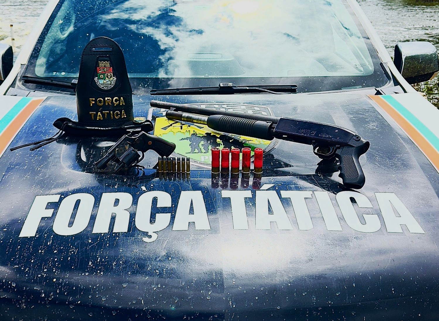 As composições receberam denúncias sobre o aluguel e venda de armas para a prática de crimes na região, e no deslocamento até a localidade de Olho d’Água, avistaram dois indivíduos que segundo populares estavam indo praticar um homicídio. Quando os policiais se aproximaram para uma abordagem, os suspeitos correram para um denso matagal, deixando para trás uma bolsa com duas armas, um revólver calibre 38, com 7 cartuchos intactos e uma espingarda de repetição calibre 12 importada, com o cano serrado e 5 cartuchos.