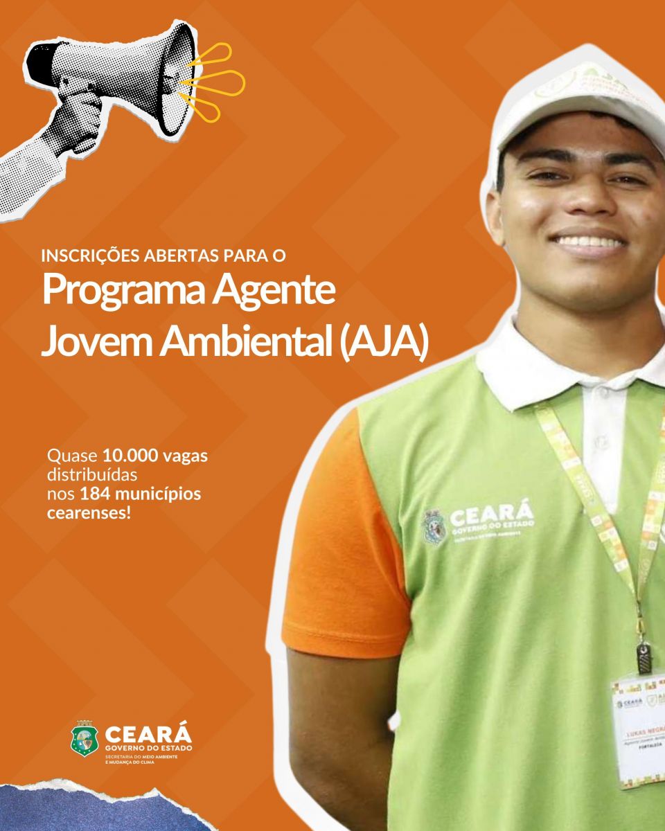 Estão abertas as inscrições para o Programa Agente Jovem Ambiental (AJA) – iniciativa do Governo do Estado coordenada pela Secretaria do Meio Ambiente e Mudança do Clima do Ceará (Sema), que visa estimular a participação de jovens em projetos sustentáveis, através da inclusão social e ambiental, viabilizando o desenvolvimento de suas competências e habilidades, ampliando as oportunidades de geração de renda e o protagonismo juvenil, focando na melhoria da qualidade de vida e na preservação do meio ambiente.