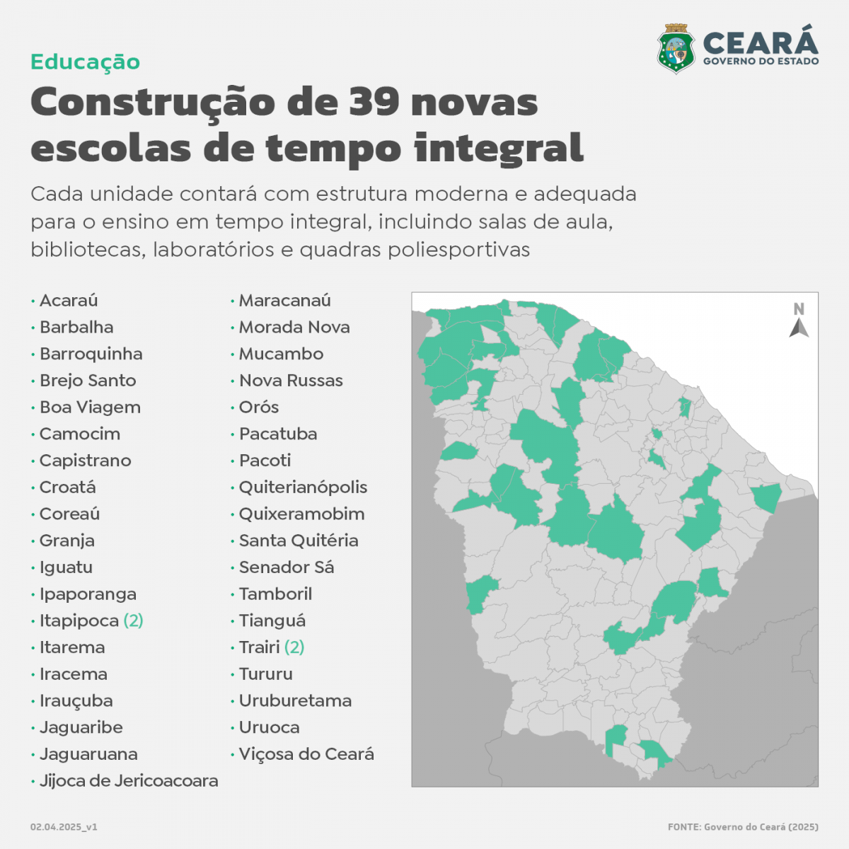 Ao todo, serão 33 Escolas de Ensino Médio em Tempo Integral (EEMTIs) e seis Escolas Estaduais de Educação Profissional (EEEPs). “Nós temos evidências de que o nosso aluno quando estuda na escola de tempo integral melhora o rendimento escolar, melhora a aprendizagem. Estamos muito animados de que isso representará uma grande mudança no padrão da qualidade da educação pública do Ceará”, acrescentou o governador, citando estudos do Banco Mundial sobre a formação de capital humano.