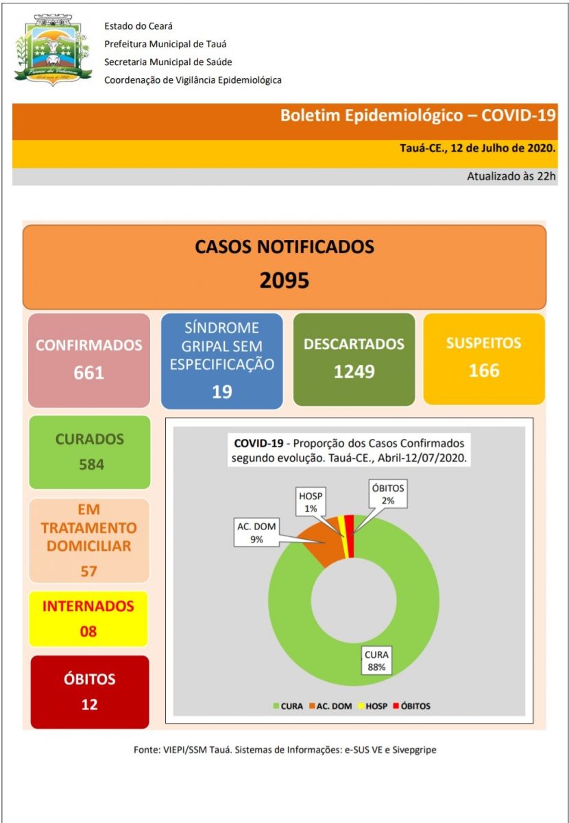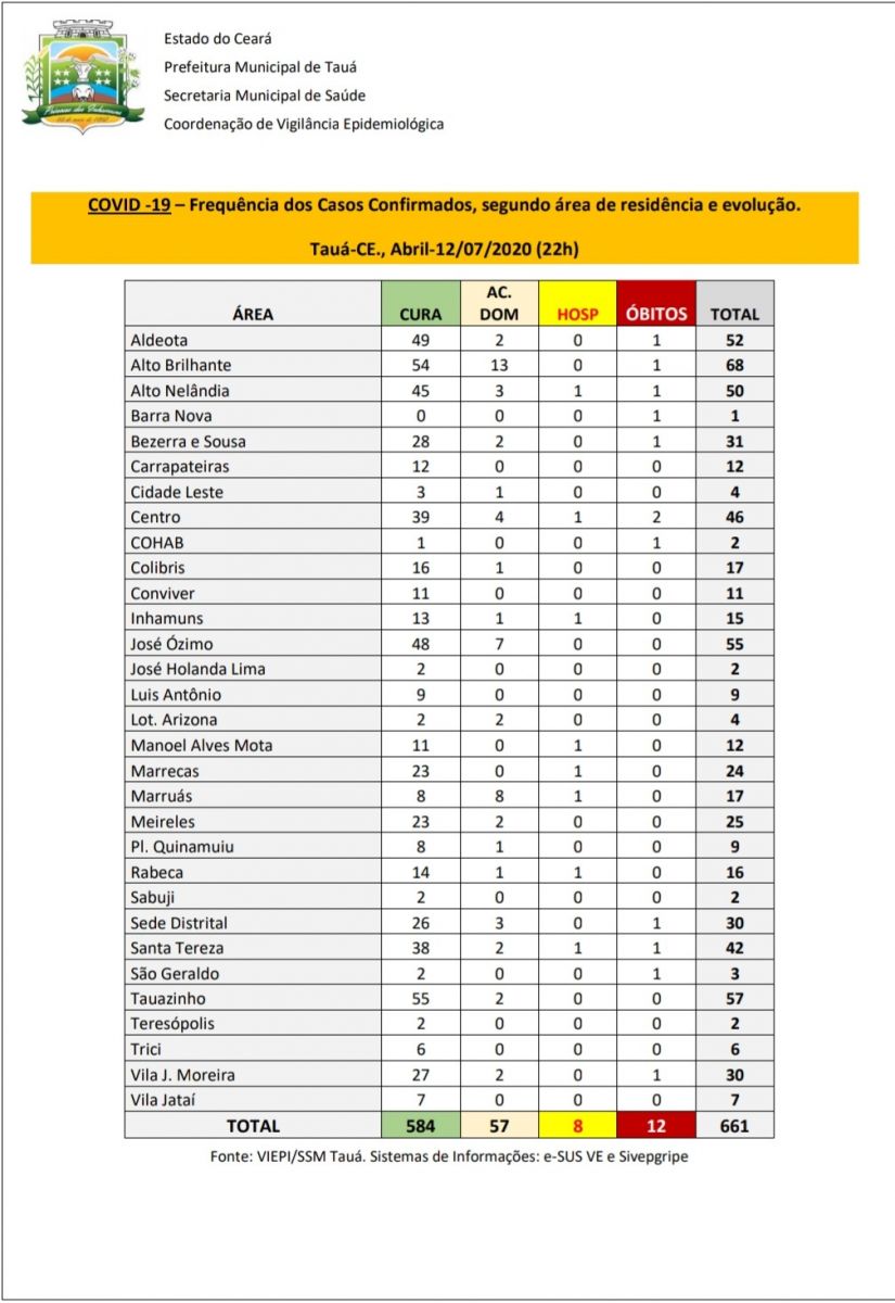 Até agora, Tauá tem 661 casos confirmados e 584 suspeitos. 12 pessoas já morreram por coronavírus.