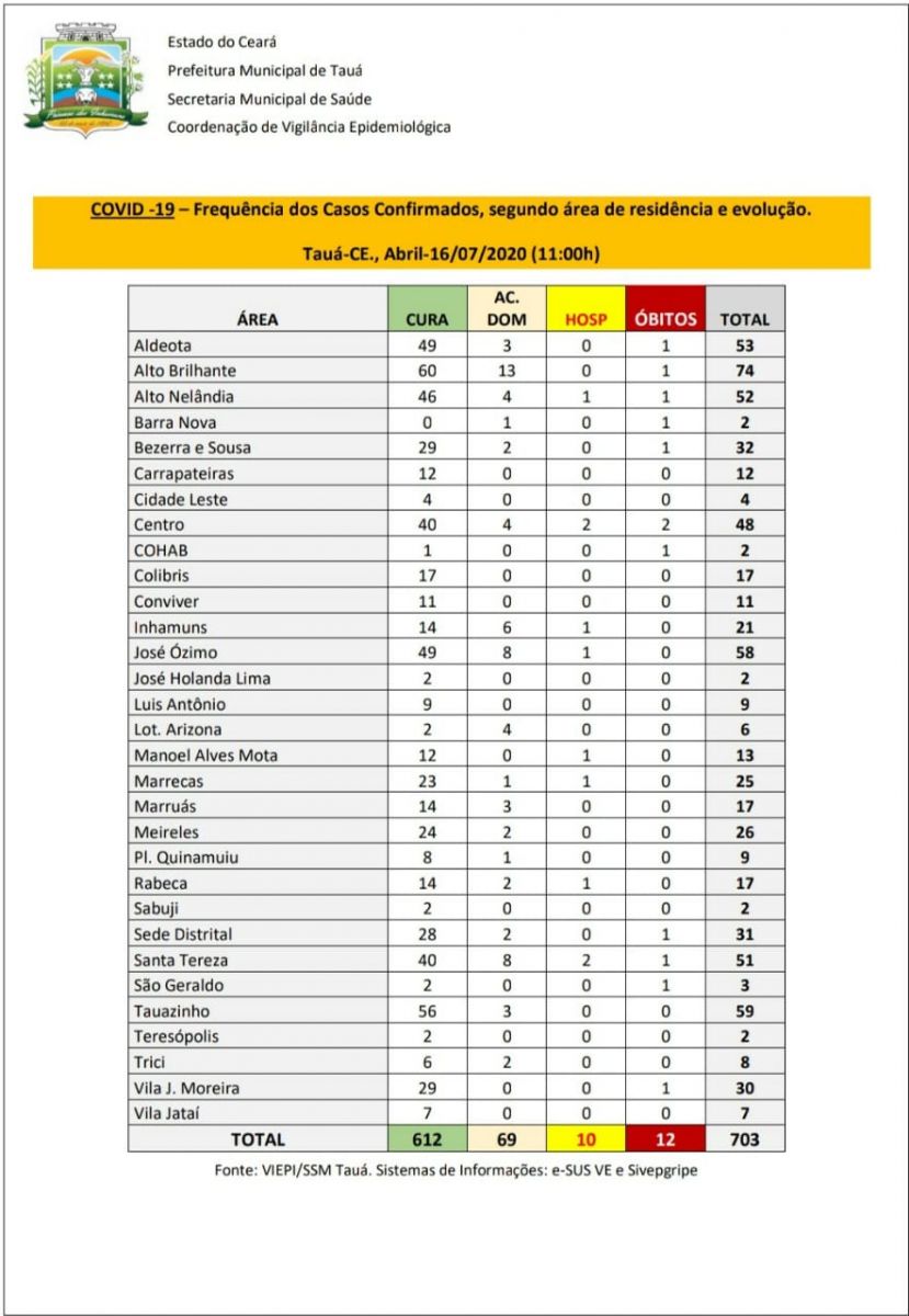 O município de Tauá já registrou 703 casos confirmados de coronavírus desde o início da pandemia, na segunda quinzena do mês de março, segundo o boletim epidemiológico divulgado hoje(16), pela Secretaria de Saúde.