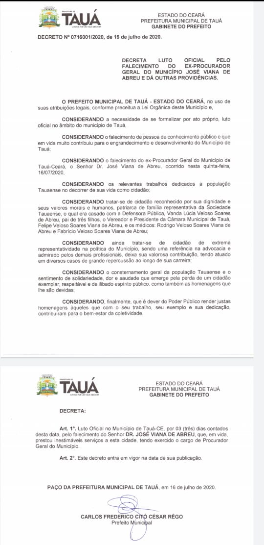 A Prefeitura de Tauá divulgou no início da tarde de hoje(16), o Decreto de Luto Oficial de 3 dias no Município pela morte do advogado e Ex-procurador Geral do Município, Dr. José Viana de Abreu, ocorrida no início dessa madrugada.