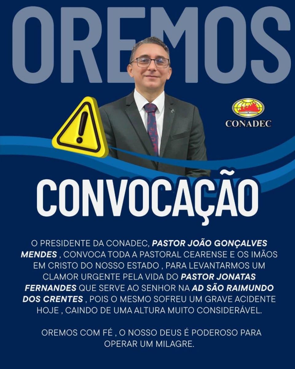 O Presidente do CONADEC (Convenção das Assembleias de Deus do Estado do Ceará), Pastor João Gonçalves Mendes, utilizou as redes sociais para convocar toda a pastoral para um clamor e oração pela vida do pastor Jonatas.