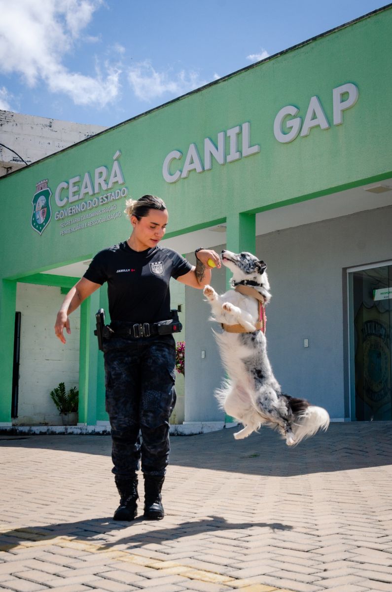 Após atuar no Grupo de Operações Regionais (GORE) e na Unidade Prisional de Segurança Máxima do Estado do Ceará (UP-Máxima), Jamile se encantou pelo trabalho do Núcleo de Operações com Cães (NOC). A conexão entre condutor e cão, aliada ao rigor técnico da atuação, foi decisiva. “Vi ali a possibilidade de unir sensibilidade com estratégia. Quando entrei, não havia mulheres no núcleo. Hoje, somos pioneiras.”