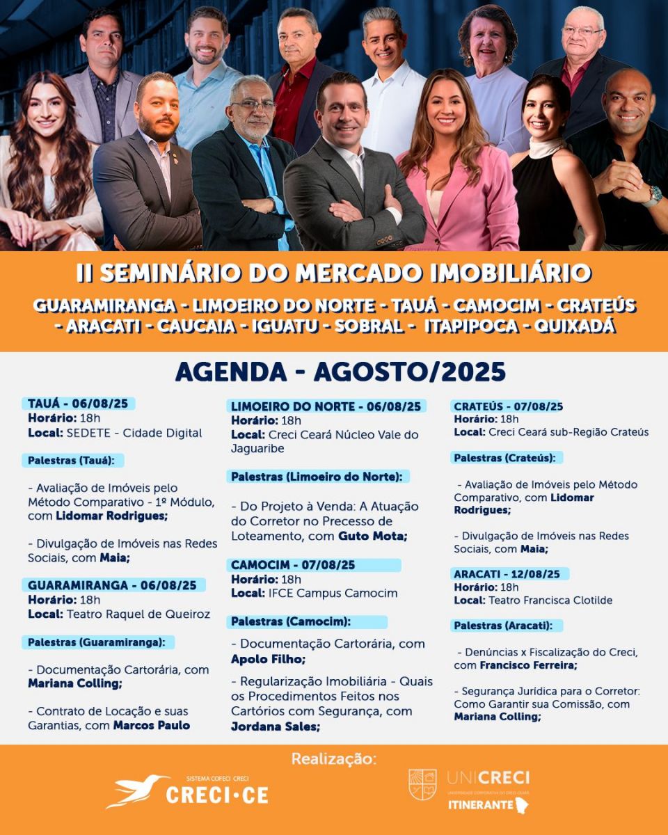 Sertão dos Inhamuns, Maciço de Baturité, Serra da Ibiapaba, Região do Vale do Jaguaribe, Litoral Oeste e Leste, Sertão Central e Região Norte do Ceará, além do município de Caucaia serão contemplados nesta edição. A expectativa do Conselho é de que, além de aperfeiçoar a atuação profissional, as capacitações também ampliem a confiança da população no mercado imobiliário, tornando as negociações mais éticas, transparentes e seguras.