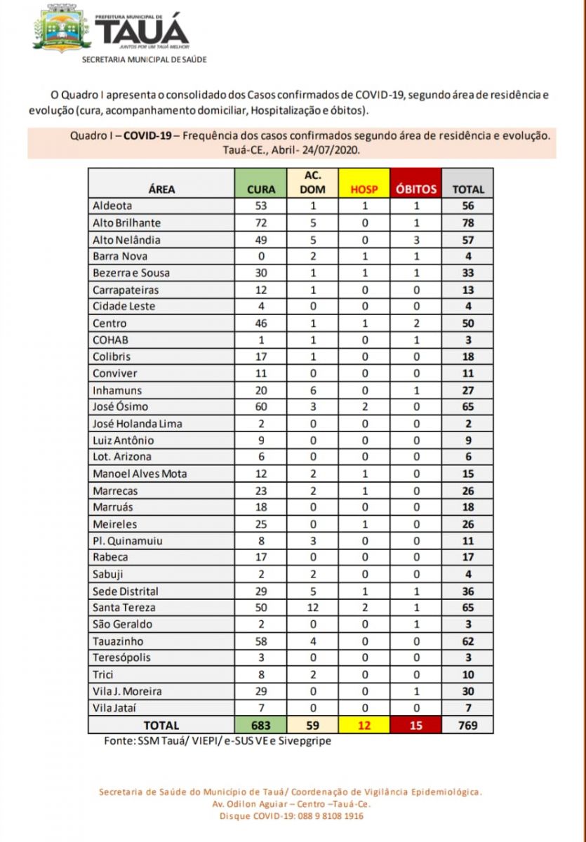 O município também confirmou o 15º óbito por coronavírus. O paciente residia no distrito de Inhamuns, zona rural do município.