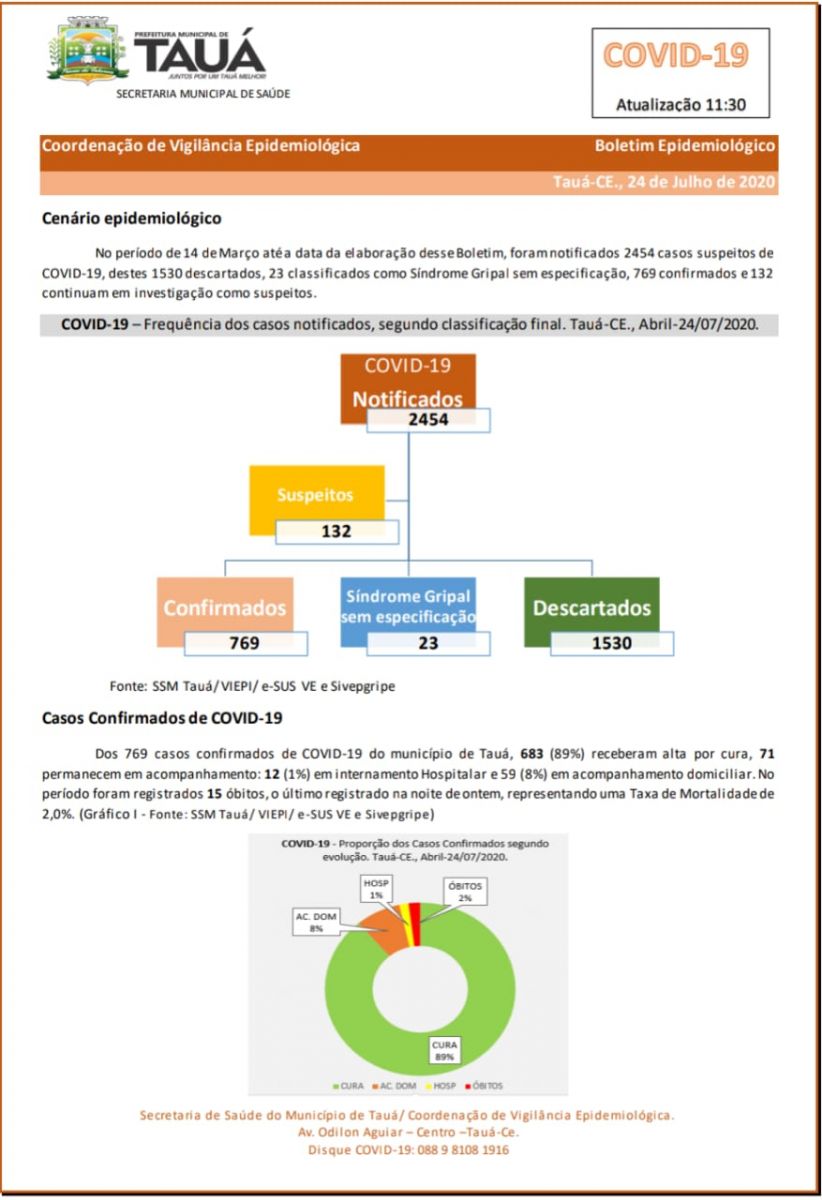 Boletim epidemiológico divulgado pela Secretaria de Saúde do município de Tauá no início da tarde de hoje(24), mostra que o número de pacientes infectados continua aumentando em proporção maior do que o número de curados. Em relação ao boletim de ontem(23), houve um aumento de 9 casos confirmados, passando de 62 para 71, destes, 59 estão em tratamento domiciliar e 12 internados.