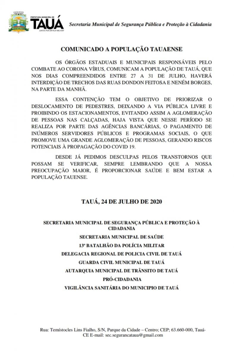 O Secretário de Segurança e Proteção a Cidadania do Município de Tauá, Cel. Deladier Feitosa encaminhou Nota ao Blog do Wilrismar informando que no período de segunda-feira(27) à sexta(31), ruas do centro comercial de Tauá serão novamente bloqueadas para o tráfego de veículos, no período da manhã.