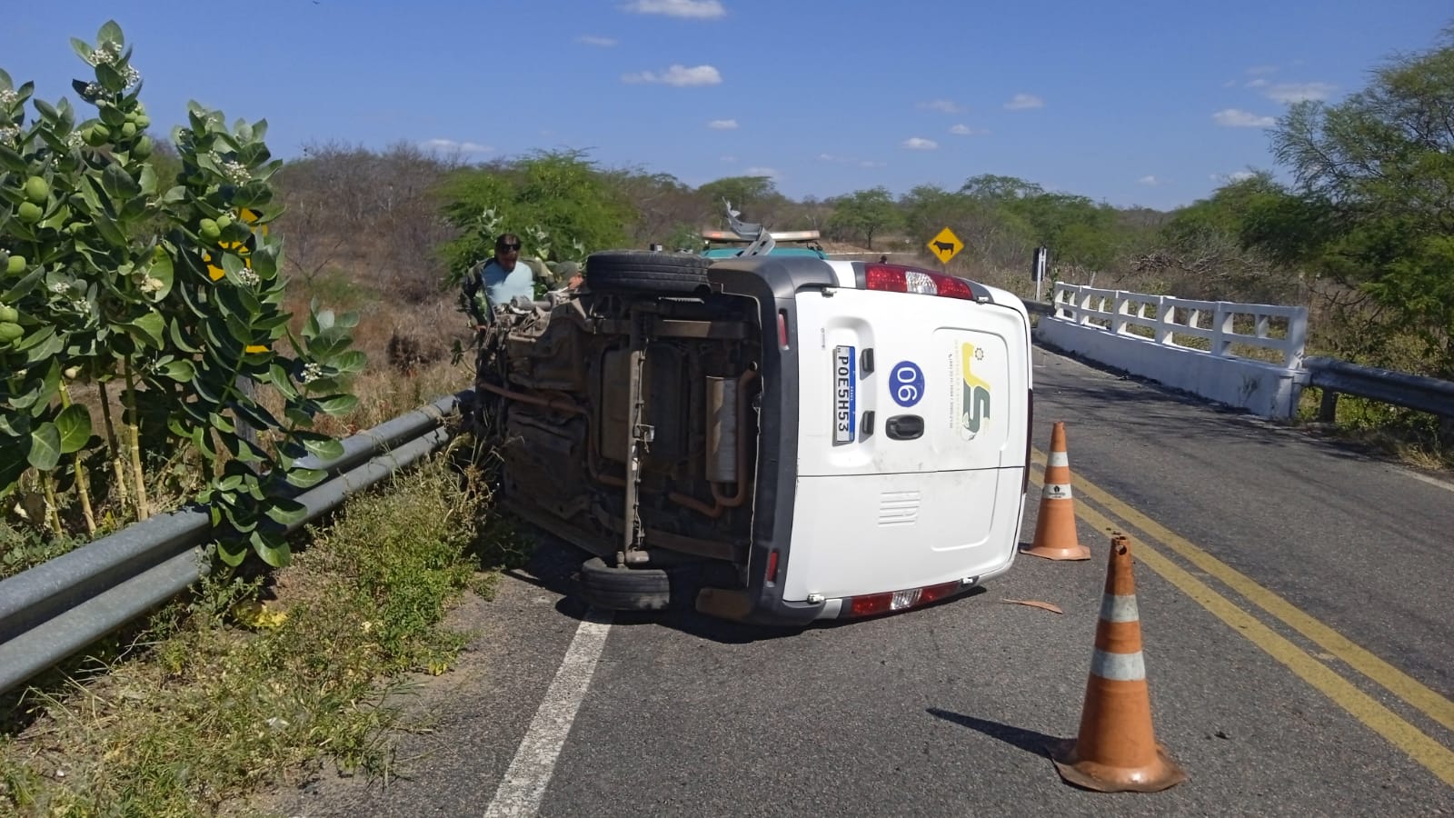 Um veículo Fiat Fiorino furgão, cor branca, ano 2019/2020, placas, POE-5H53, com inscrição de Juazeiro do Norte, capotou por volta de 13h50 de hoje (15/09), na CE-176, a altura da ponte das Melancias, próximo a cidade de Tauá.