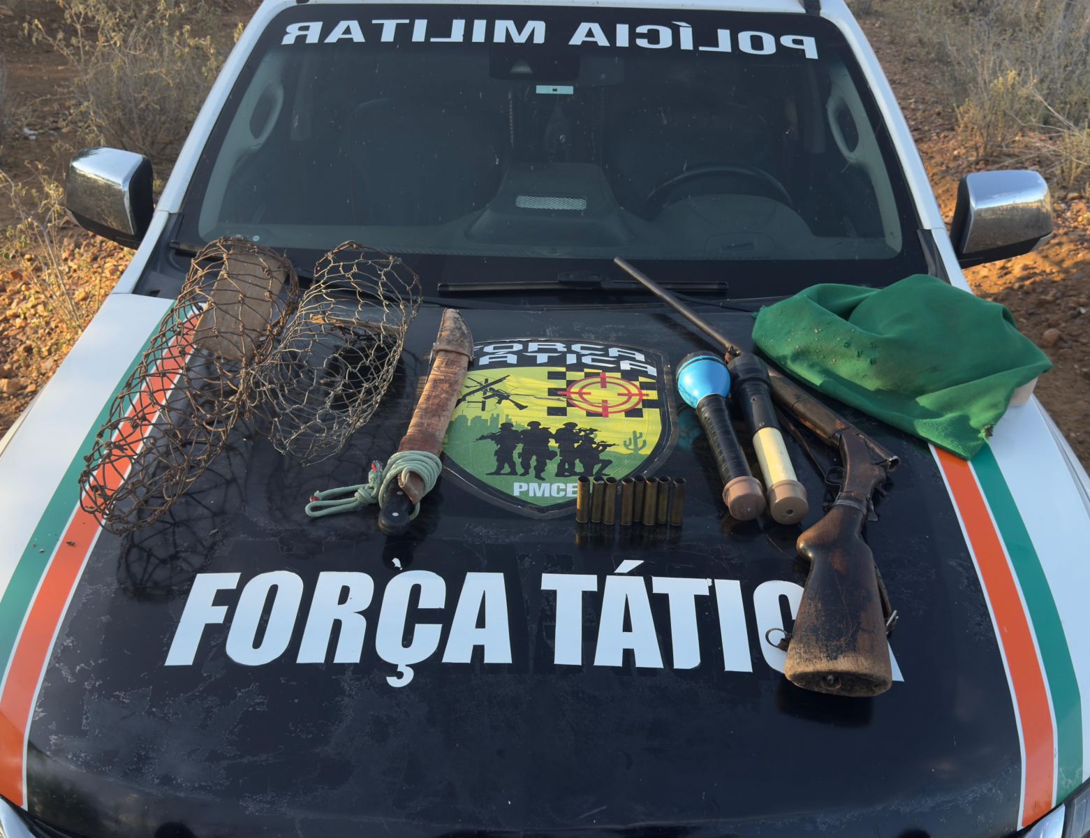 Policiais da Força Tática do 13º BPM, em Tauá, apreenderam material de caça e uma arma no Distrito de Carrapateiras.