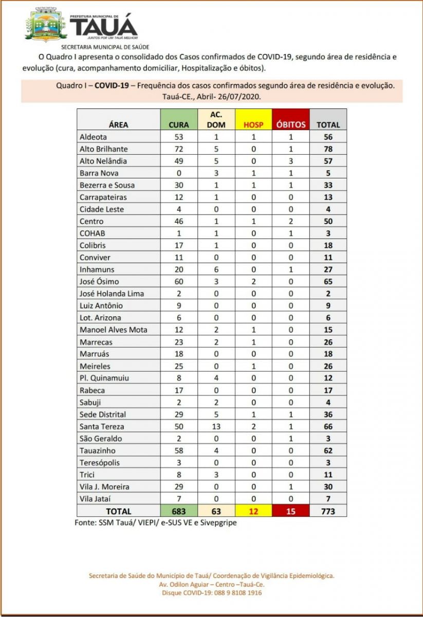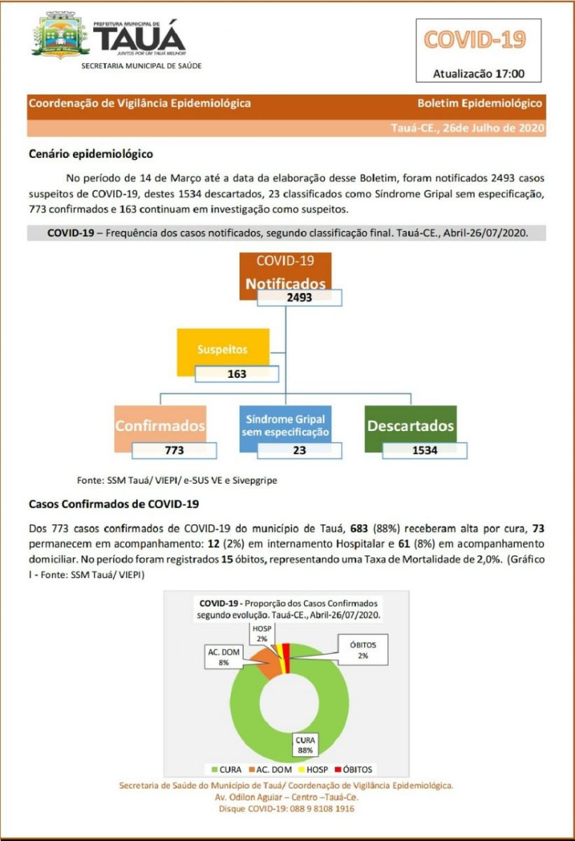 A Secretaria de Saúde do município de Tauá divulgou no início da noite de hoje(26), um novo boletim epidemiológico atualizando os números da pandemia do coronavírus.