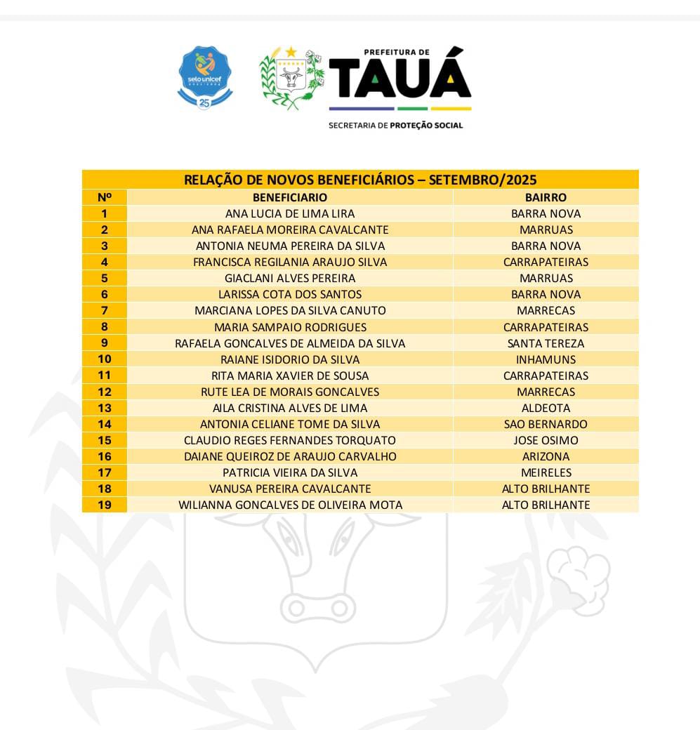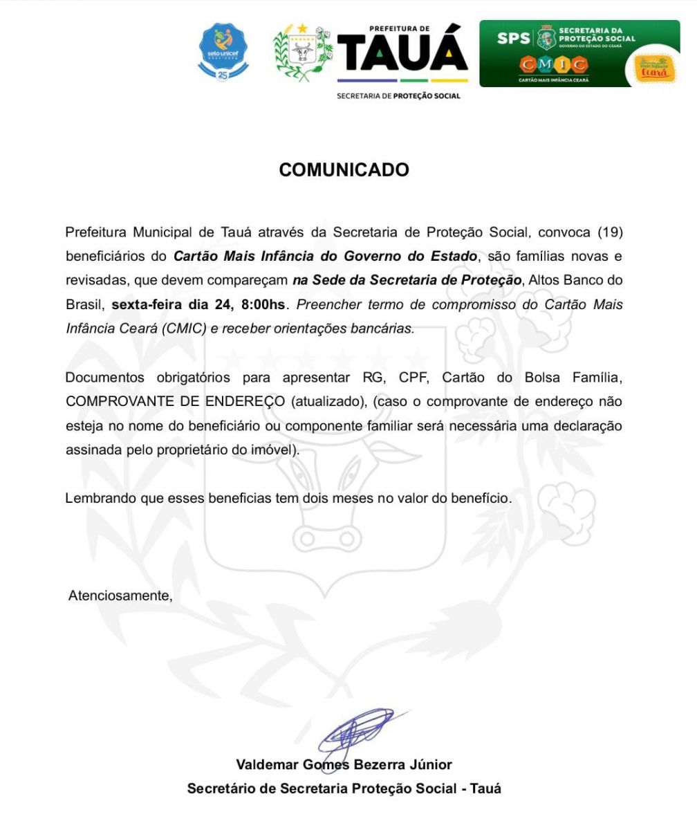 Os relacionados deverão comparecer nesta sexta-feira (24/10), a partir das 8h da manhã na Sede da Secretaria de Proteção Social, situada no primeiro andar do prédio da agência do Banco do Brasil, para o preenchimento do Termo de Compromisso do programa e recebimento das orientações bancárias.