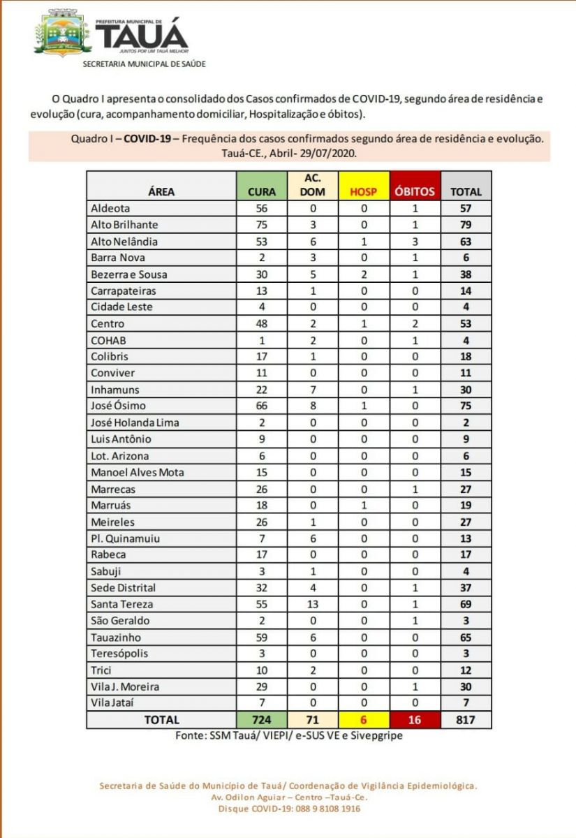 O Boletim Epidemiológico divulgado no início da manhã de hoje(30) pela Secretaria de Saúde confirma o 16º óbito por coronavírus e mostra que continua aumentando o número de casos de Covid-19 no município de Tauá.