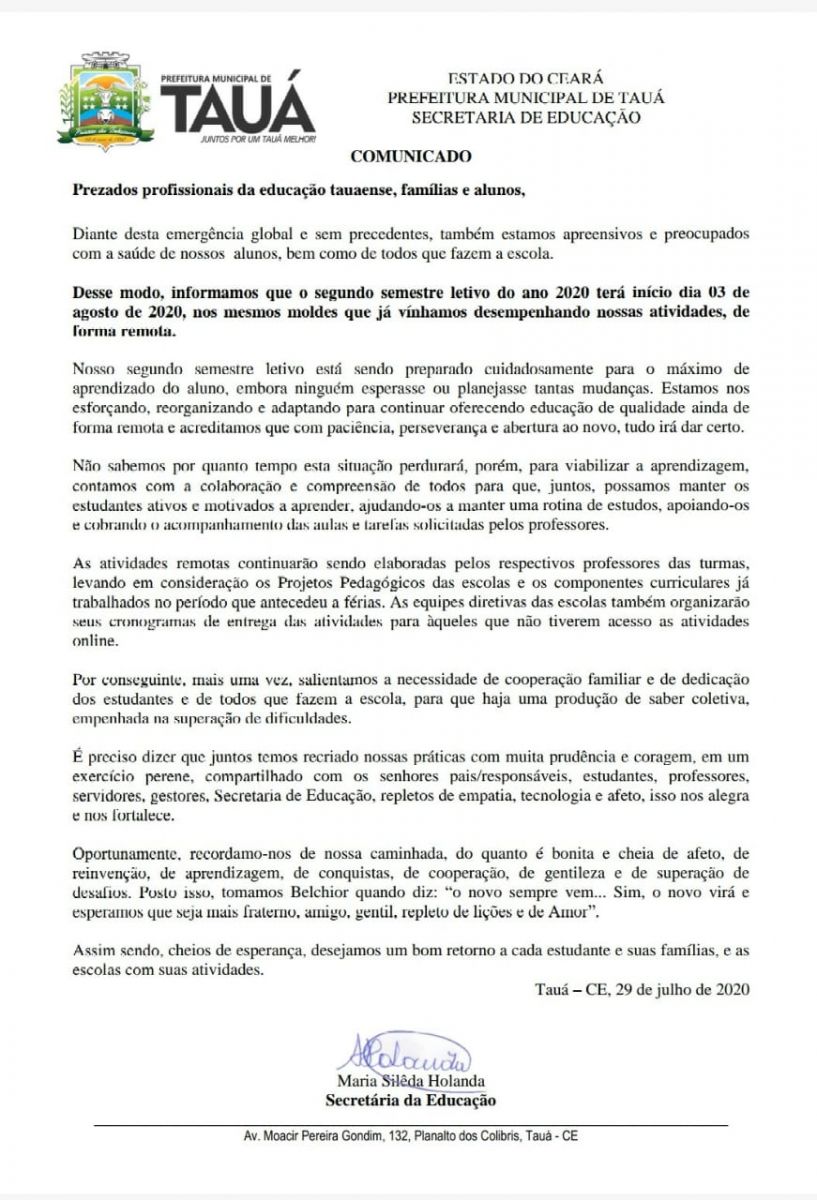 A Secretaria de Educação do município de Tauá divulgou comunicado na manhã de hoje(30) informando que as aulas remotas serão retomadas a partir de segunda-feira(03), após as férias do mês de julho.